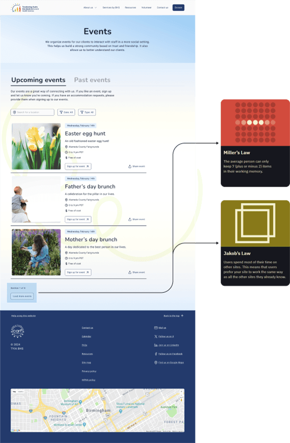 In our solution, we invoked Miller’s law as well as Jakob’s law to allow our users time to digest information about our latest events before loading more events for their consideration.