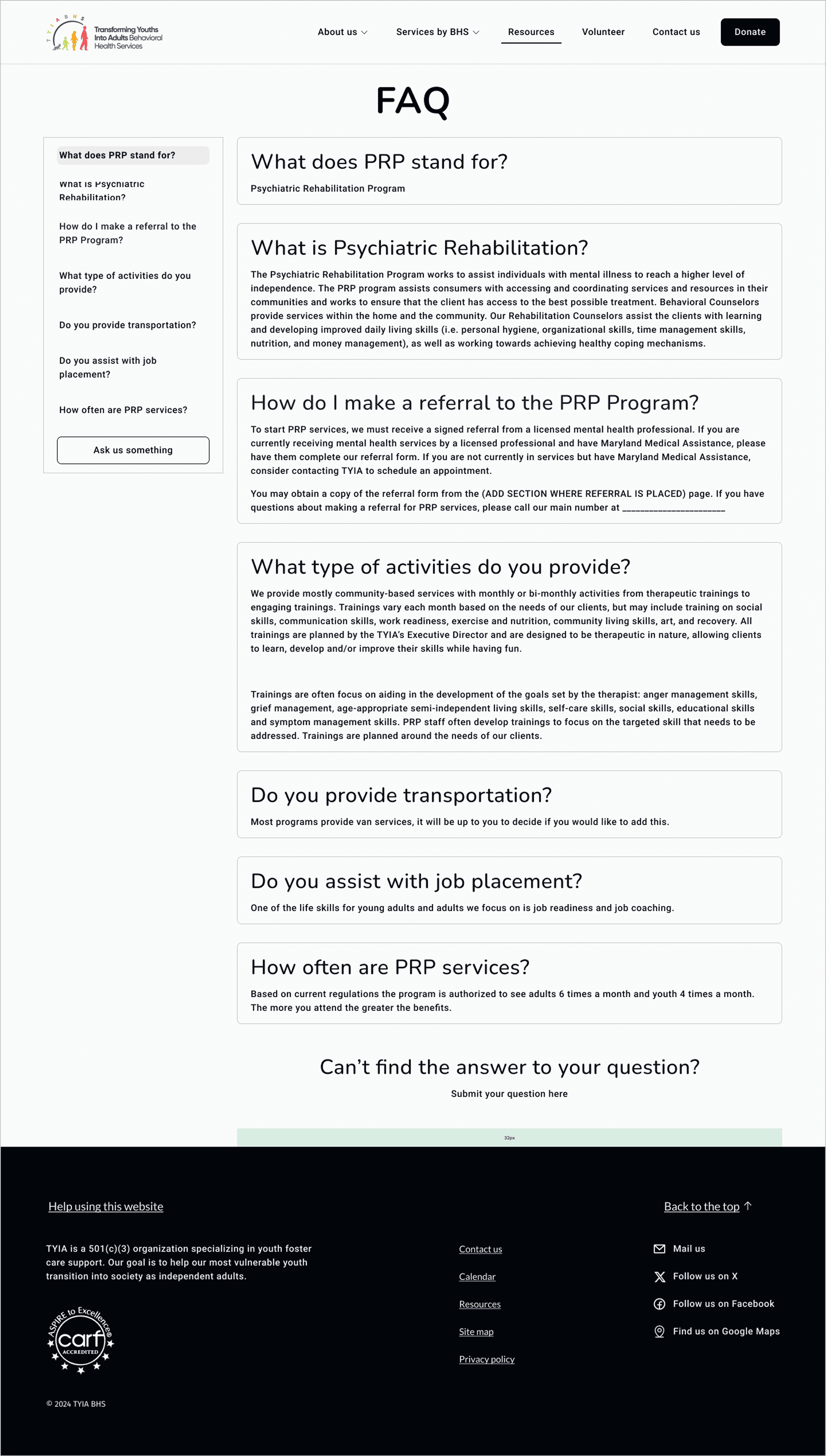 Transforming Youths into Adults (TYIA) is a non-profit organization that offers behavioral health services (BHS). The BHS services were originally listed on the TYIA website, which is targeted towards young adults in foster care, while the BHS services are available to everyone. We were employed by TYIA to create a new, separate, and distinct site for the BHS services that has its own unique look but also relates back to TYIA and their work.