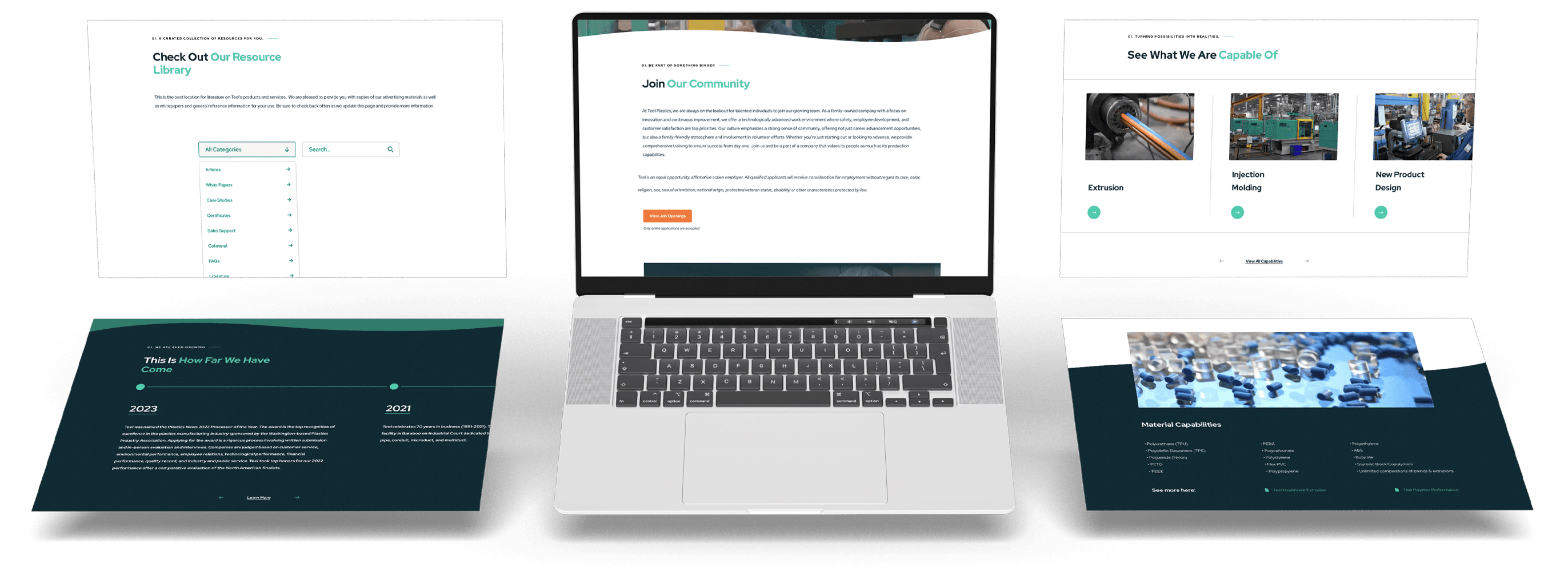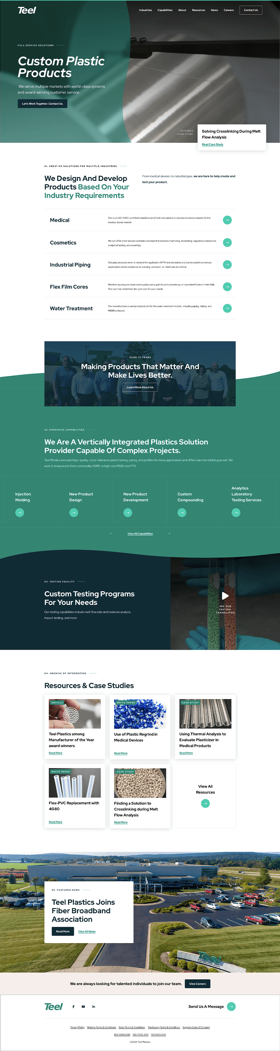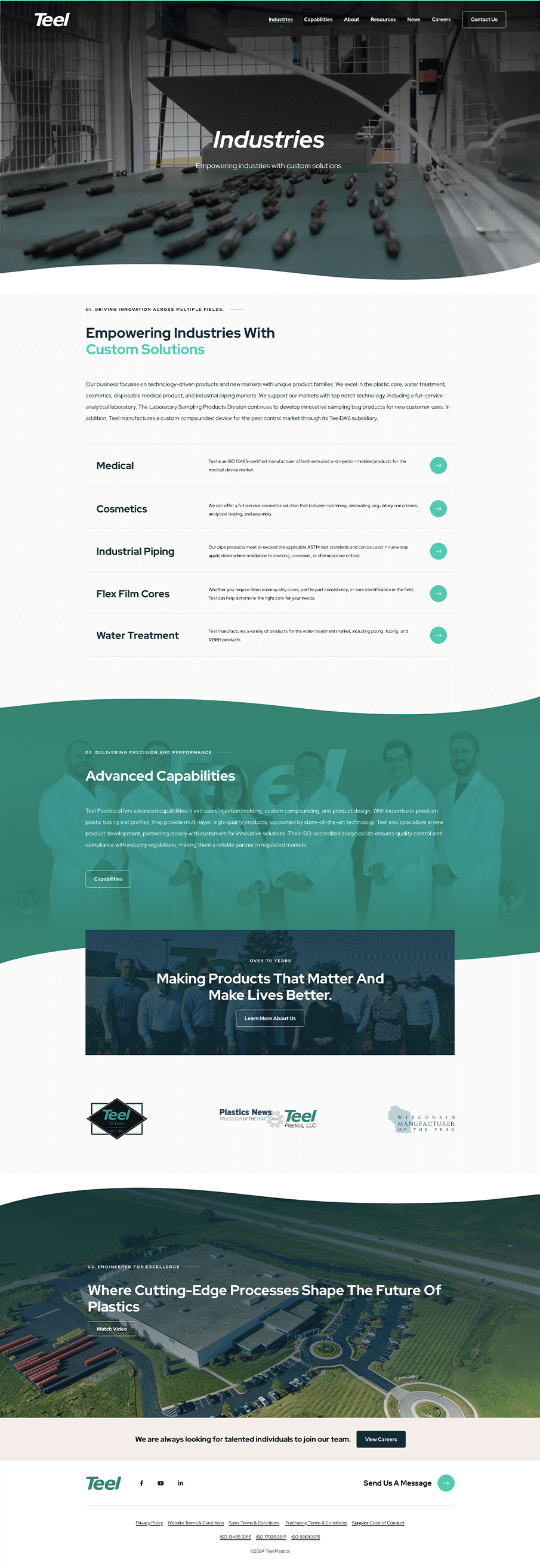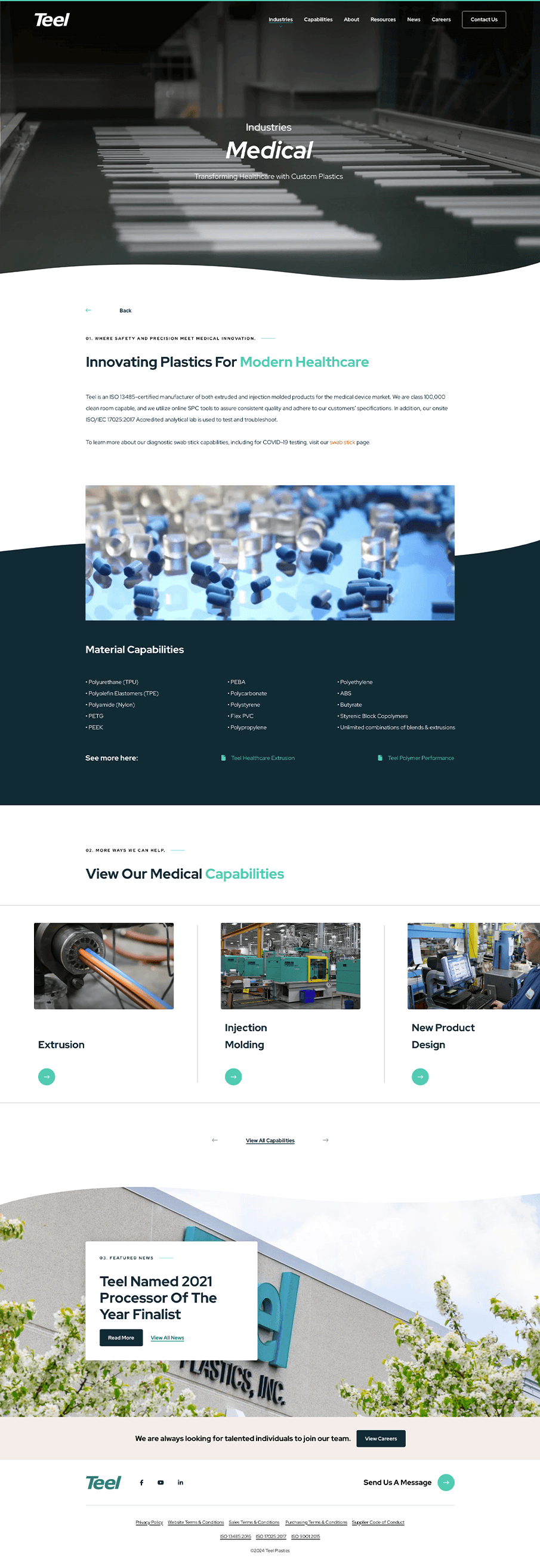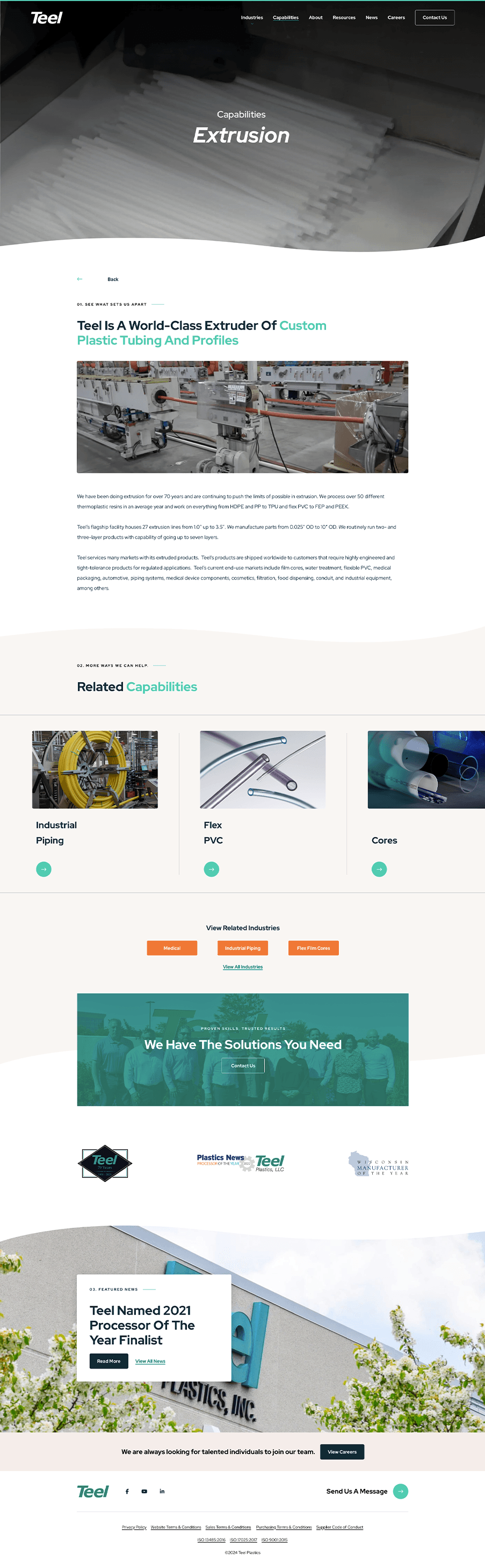 In designing the Extrusion page, a child page to the Capabilities page, I aimed to communicate Teel Plastics’ advanced extrusion capabilities in a detailed yet accessible format. The page showcases Teel’s proficiency with high-tolerance, multi-layer tubing and profiles, tailored for diverse industries such as medical devices and automotive. I organized the content to emphasize Teel’s unique assets—like the use of over 50 thermoplastic resins and 27 extrusion lines—to build credibility and foster trust. Additionally, I incorporated links to related capabilities and industry applications, creating an interconnected experience that encourages users to explore Teel’s broader expertise.