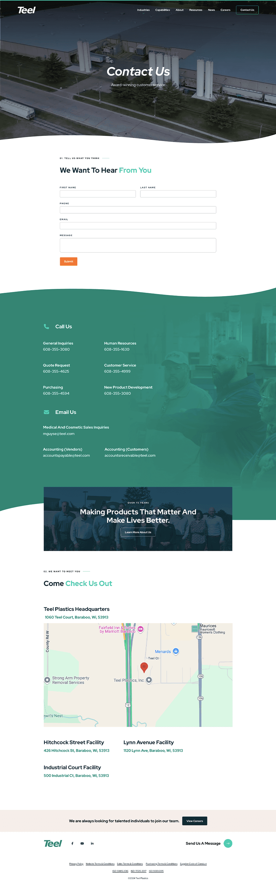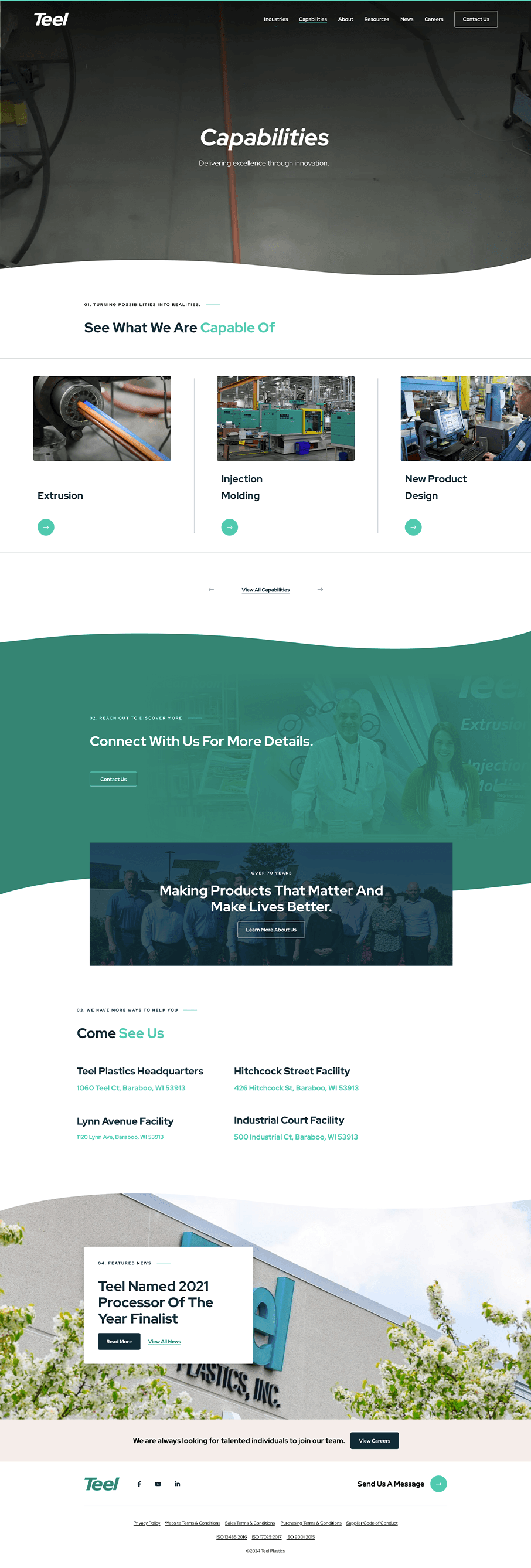 In designing the Capabilities page, my goal was to clearly convey Teel Plastics’ core technical strengths in a way that builds trust and encourages engagement. I structured the page to highlight key capabilities—such as extrusion, injection molding, and new product design—with concise, informative sections that allow users to quickly understand each area of expertise. To further enhance user experience, I included direct contact information and an overview of Teel’s facilities, reinforcing their credibility as a precision manufacturing partner. This design approach provides a balance of information and accessibility, encouraging potential clients to connect for more details.
