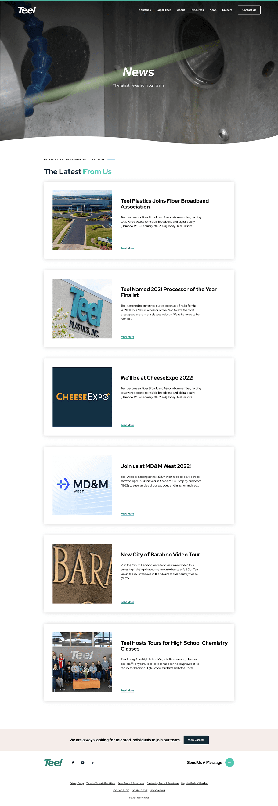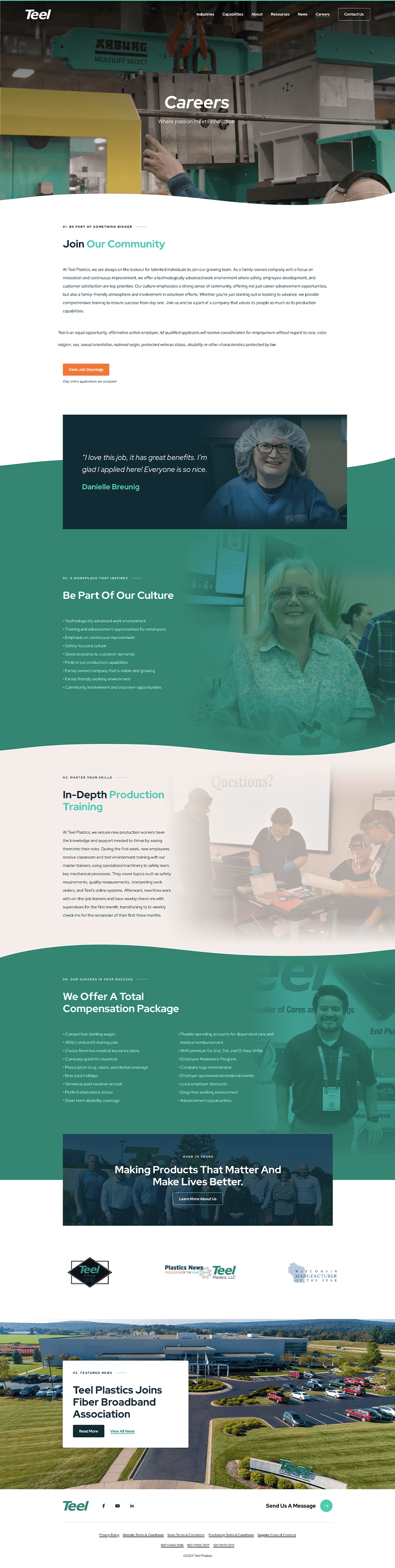 The About Us page was designed to provide users with a comprehensive introduction to the company’s mission, values, and achievements. I structured the page to highlight Teel’s dedication to innovation and quality, incorporating elements like an interactive timeline for key milestones and recent awards to build credibility. Key sections guide users to learn more about Teel’s facilities, explore recent news, and view career opportunities, creating a complete brand experience. My goal was to design a page that not only informs but also builds trust and engagement with potential clients and employees.