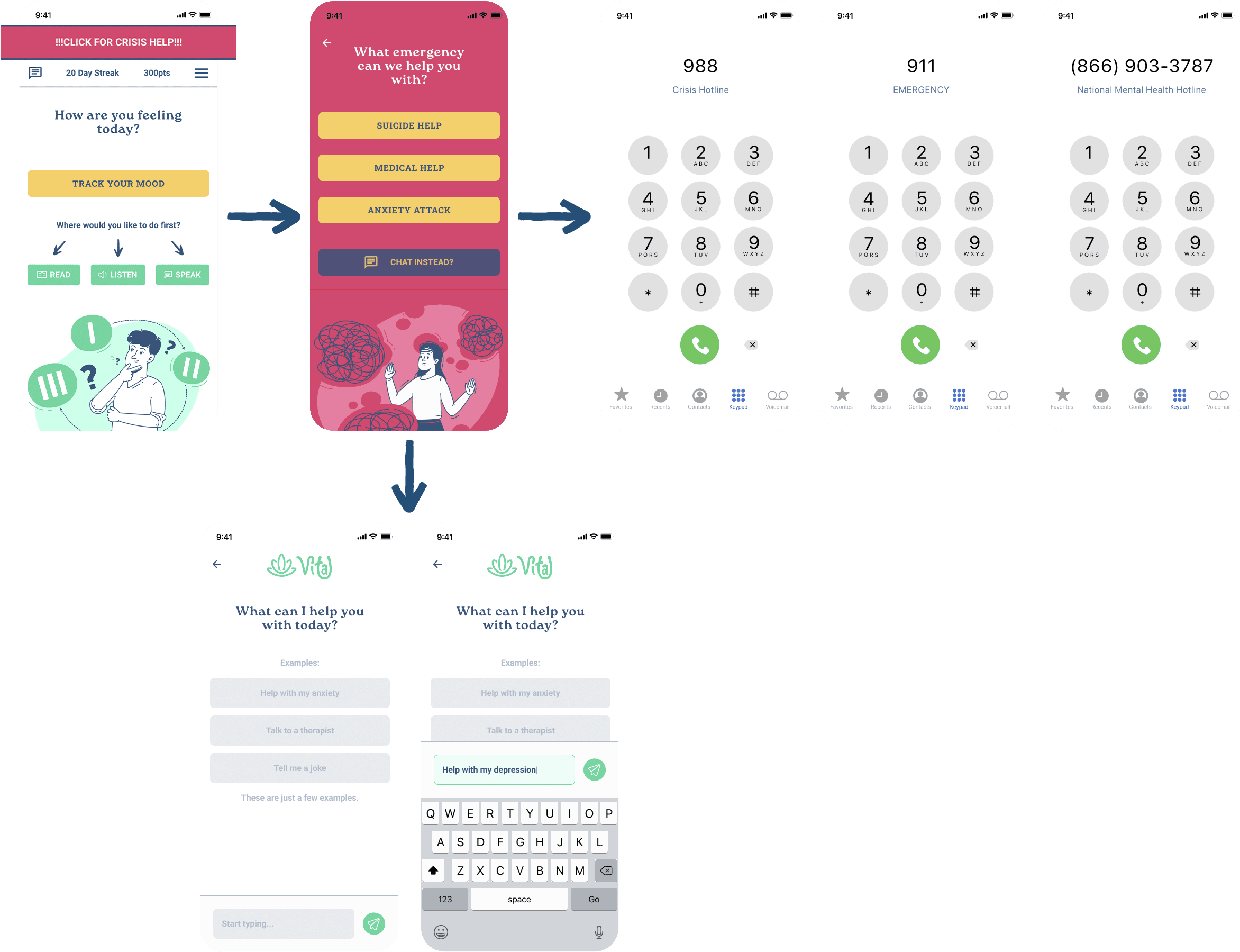 I have implemented a clickable red banner positioned at the top of the screen, providing users with swift access to crisis assistance. When you click the button, it seamlessly guides you to a screen where you can select the specific type of help you require. By interacting with the buttons on this screen, you'll be seamlessly redirected to your phone dial screen, with the corresponding number already pre-dialed for your convenience.